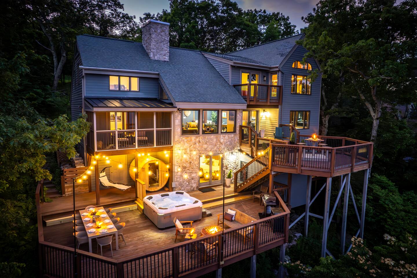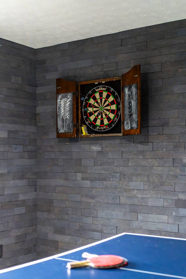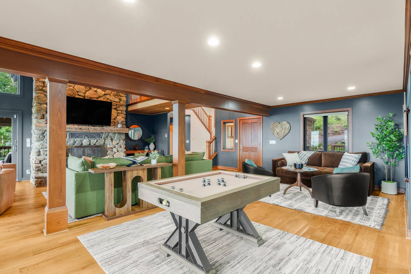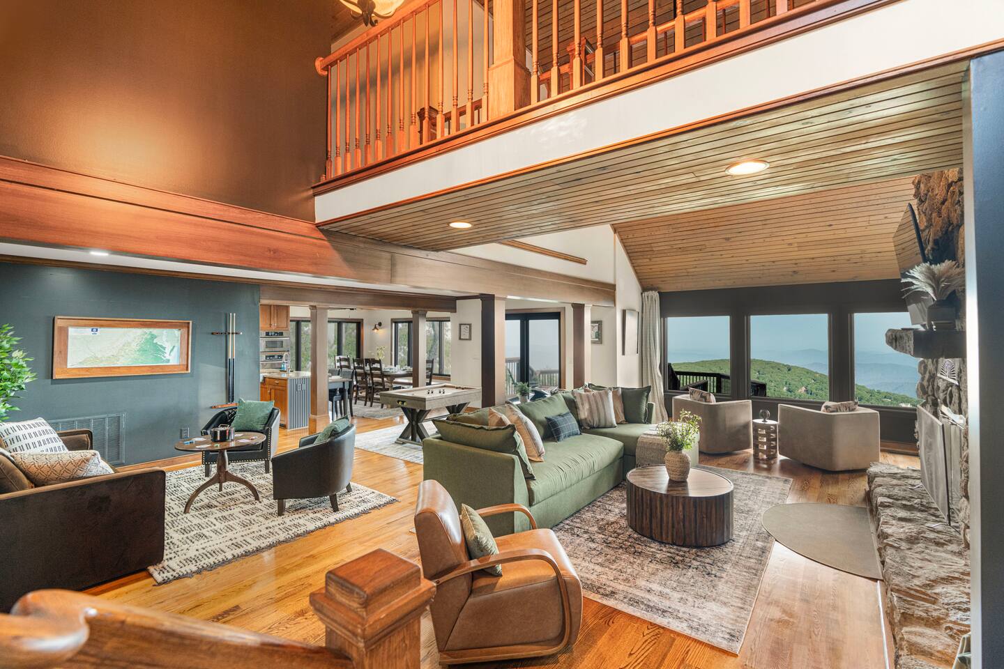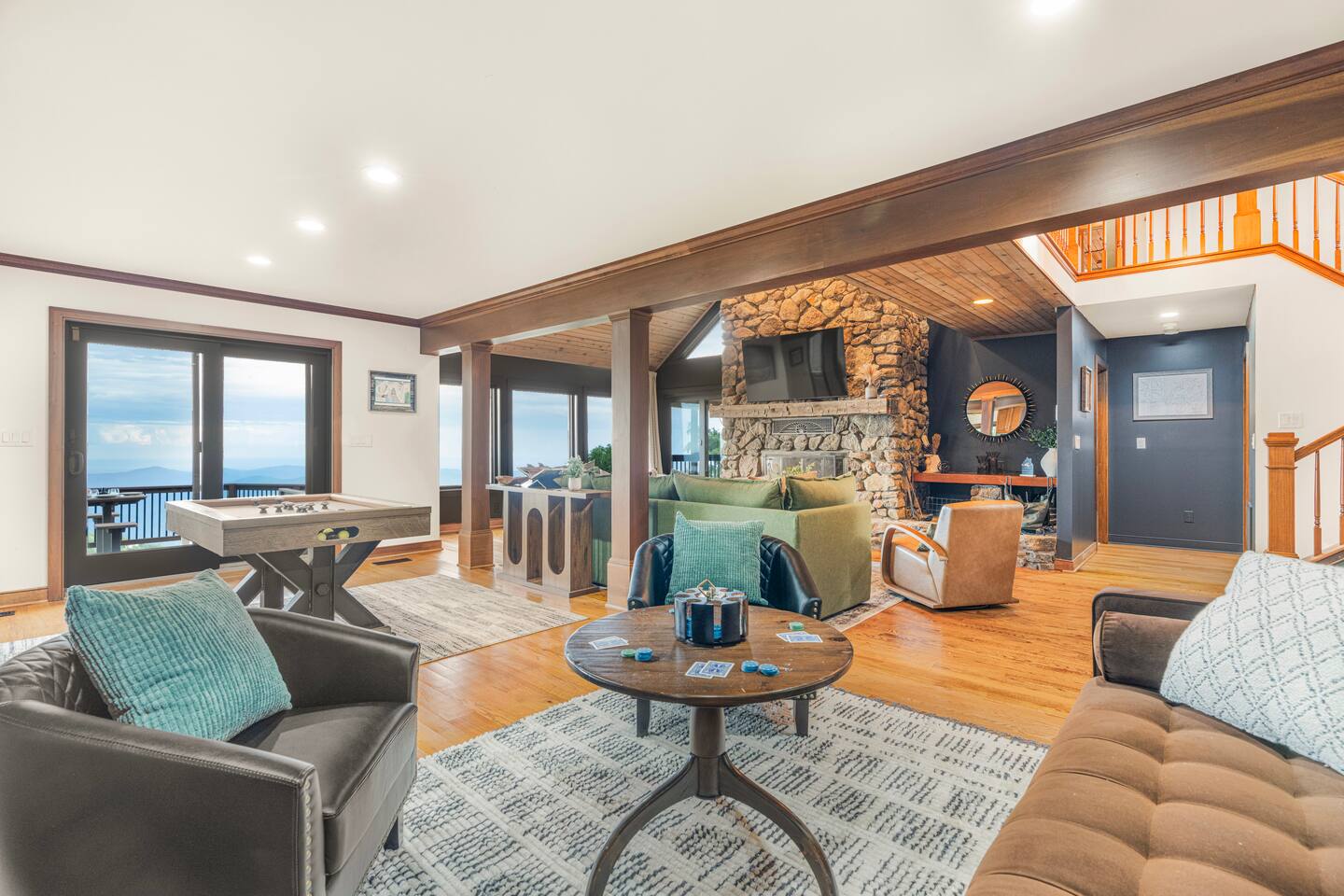 There's a ton to do in the area! Stargazer is about a mile to the slopes and a few minutes’ drive to all the dining and entertainment at Wintergreen. Some of the best hiking trails in the state are off the Blue Ridge Parkway (15 minutes from the home). Also nearby are two sandy-beach-entrance lakes plus a community pool for swimming, and over dozen wineries, breweries, and distilleries- all within a 30 minute drive. The home layout is as follows: Decks: - The small deck directly off of the living room features two Adirondack chairs and a high-top table for 4 to soak in the views - This deck also connects to the larger lower deck, which features a hot tub, barrel sauna, gas firepit (propane provided), grill with prep table, and a dining set for 10. - Additionally, there is a small balcony that connects to both the primary bedroom and a hall bedroom with a few chairs (chairs not pictured). Main level: (Note: there are zero steps required to enter main level from driveway) - Grand living room with big screen TV, wood-burning fireplace, bumper pool table, and separate lounge seating area. Both sofas pull out to beds if needed. - Screened in porch with endless views - Dining table can seat 10, plus room for 4 more at the kitchen bar - Fully stocked kitchen with granite counters, stainless appliances, and gas range. - BR 1: Master bedroom with king bed and ensuite bathroom - Half bath - Laundry room with full size washer and dryer Upper level: - BR 2: Primary bedroom with king bed, fireplace, vaulted beamed ceilings, and access to balcony. Ensuite bathroom features double vanities and tile shower - BR 3: Queen bedroom with balcony access - BR4: Queen bedroom - Hall bath with shower Lower level: - Game room with ping pong table, shuffleboard, darts, TV, and additional refrigerator - BR 5: Queen bedroom with access to lower deck - BR 6 / theater room: Upper portion of this room has a full bed, and lower portion of this room is set up as a theater with 6 leather chairs and massive TV - Hall bath with double vanities and tiled shower/tub combo