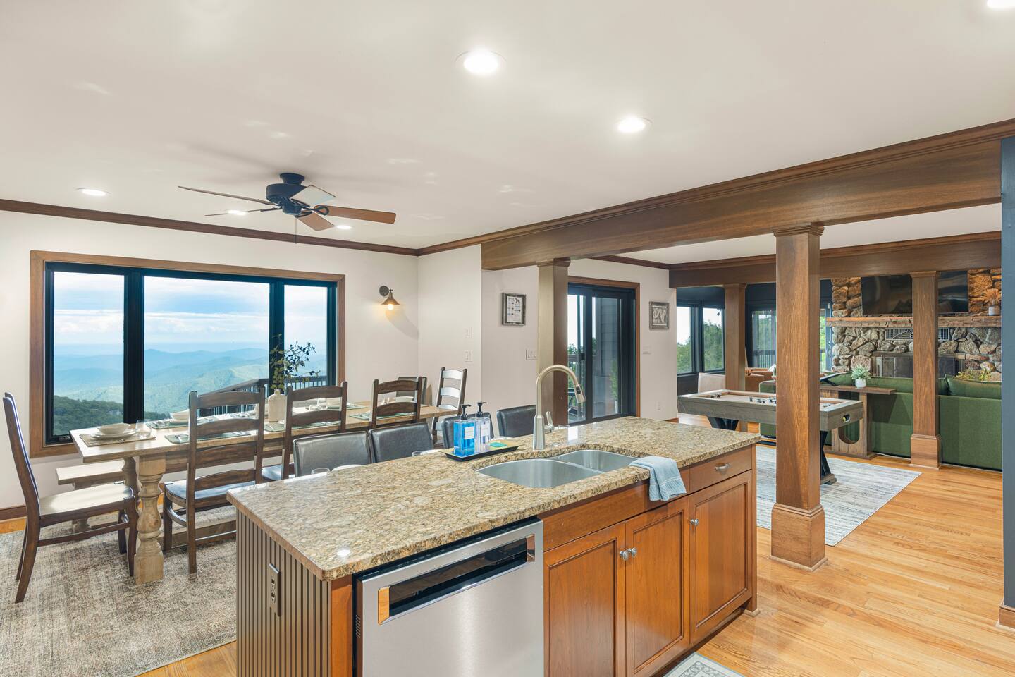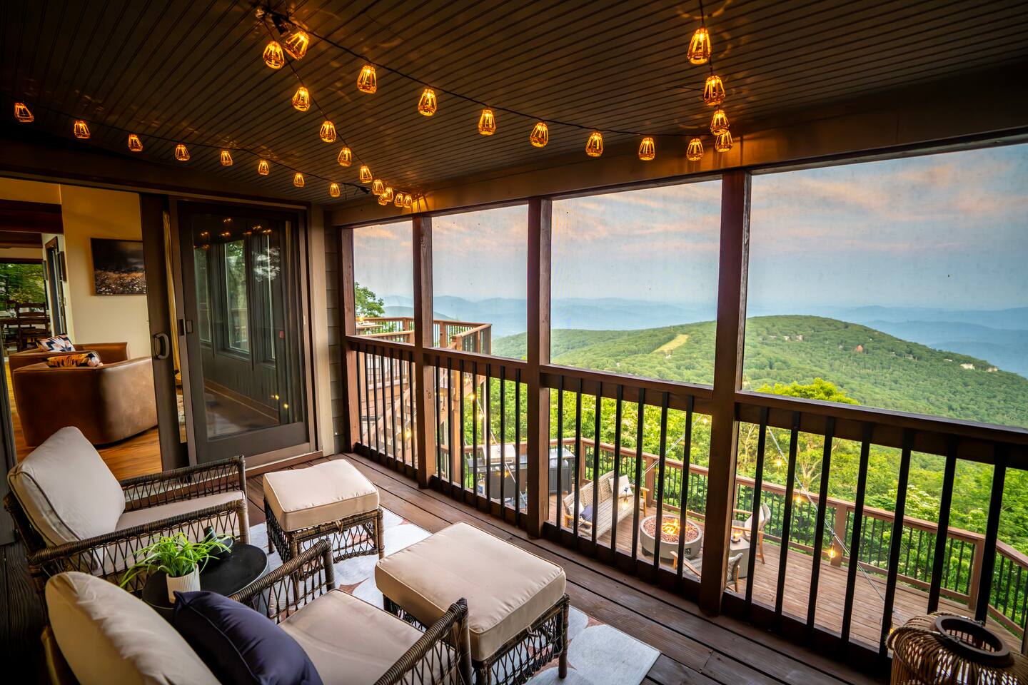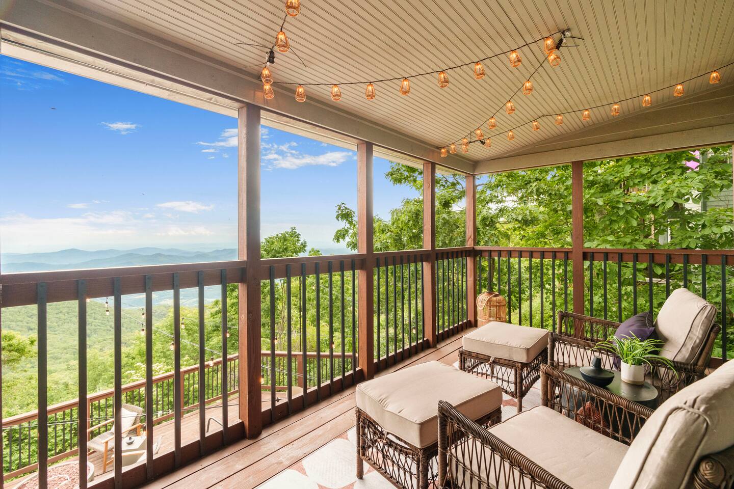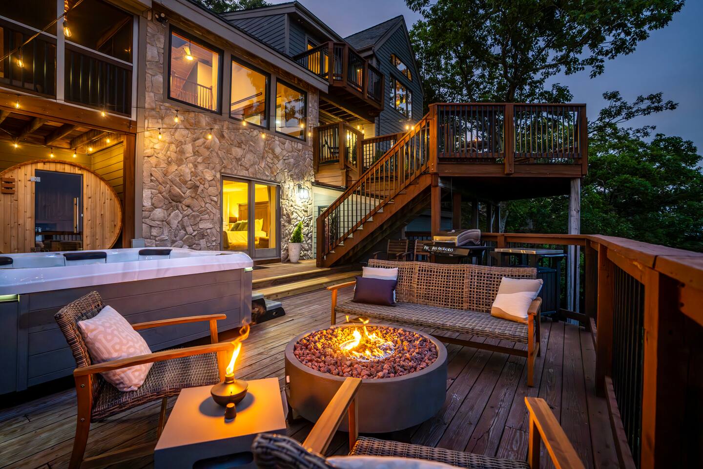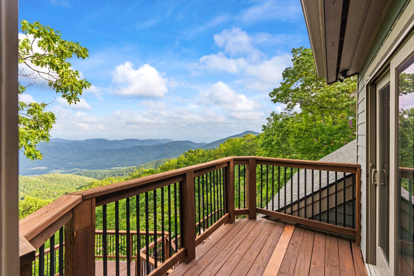 There's a ton to do in the area! Stargazer is about a mile to the slopes and a few minutes’ drive to all the dining and entertainment at Wintergreen. Some of the best hiking trails in the state are off the Blue Ridge Parkway (15 minutes from the home). Also nearby are two sandy-beach-entrance lakes plus a community pool for swimming, and over dozen wineries, breweries, and distilleries- all within a 30 minute drive. The home layout is as follows: Decks: - The small deck directly off of the living room features two Adirondack chairs and a high-top table for 4 to soak in the views - This deck also connects to the larger lower deck, which features a hot tub, barrel sauna, gas firepit (propane provided), grill with prep table, and a dining set for 10. - Additionally, there is a small balcony that connects to both the primary bedroom and a hall bedroom with a few chairs (chairs not pictured). Main level: (Note: there are zero steps required to enter main level from driveway) - Grand living room with big screen TV, wood-burning fireplace, bumper pool table, and separate lounge seating area. Both sofas pull out to beds if needed. - Screened in porch with endless views - Dining table can seat 10, plus room for 4 more at the kitchen bar - Fully stocked kitchen with granite counters, stainless appliances, and gas range. - BR 1: Master bedroom with king bed and ensuite bathroom - Half bath - Laundry room with full size washer and dryer Upper level: - BR 2: Primary bedroom with king bed, fireplace, vaulted beamed ceilings, and access to balcony. Ensuite bathroom features double vanities and tile shower - BR 3: Queen bedroom with balcony access - BR4: Queen bedroom - Hall bath with shower Lower level: - Game room with ping pong table, shuffleboard, darts, TV, and additional refrigerator - BR 5: Queen bedroom with access to lower deck - BR 6 / theater room: Upper portion of this room has a full bed, and lower portion of this room is set up as a theater with 6 leather chairs and massive TV - Hall bath with double vanities and tiled shower/tub combo