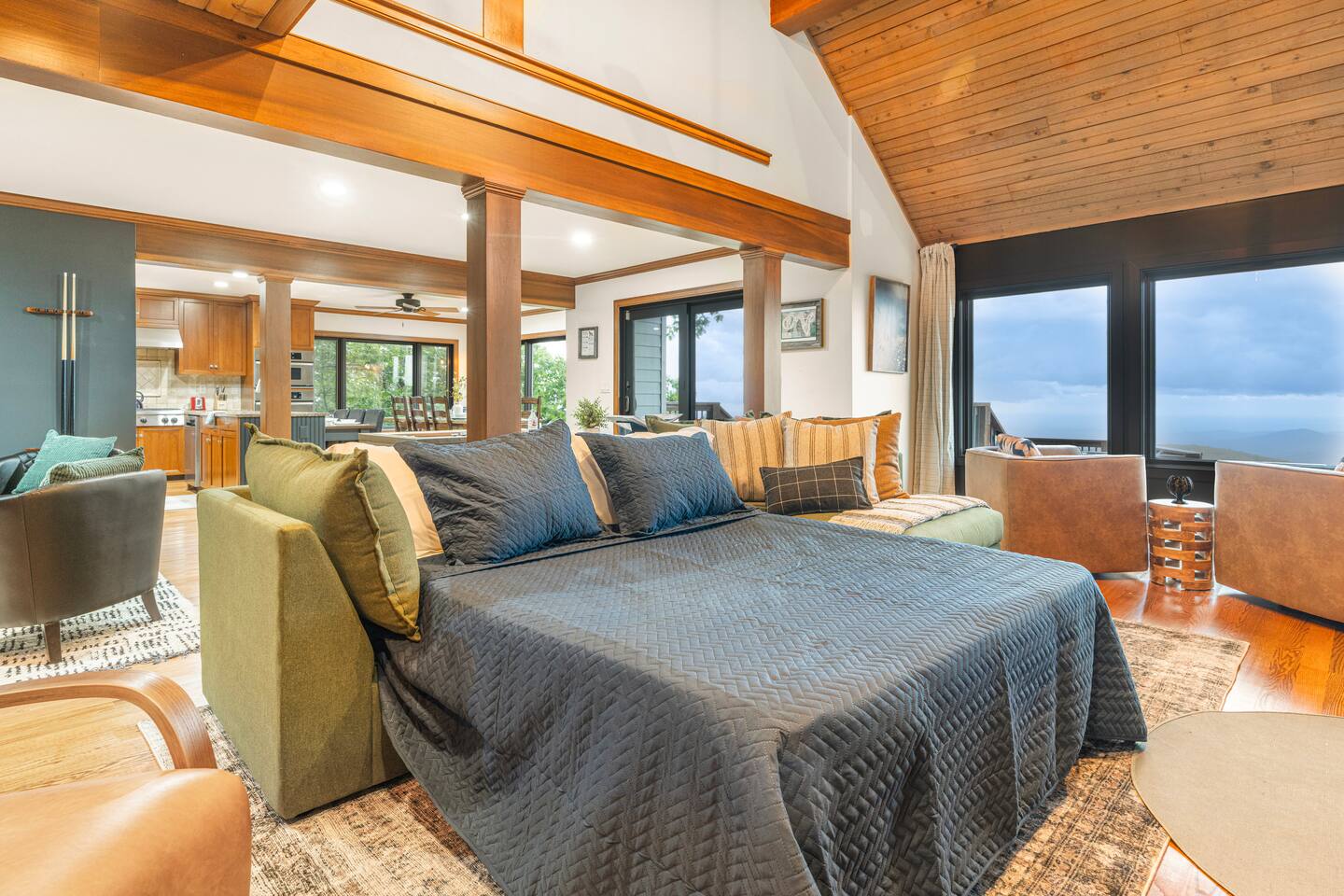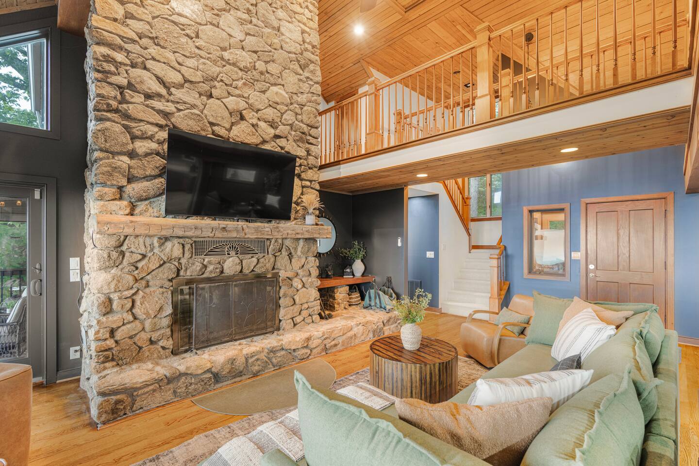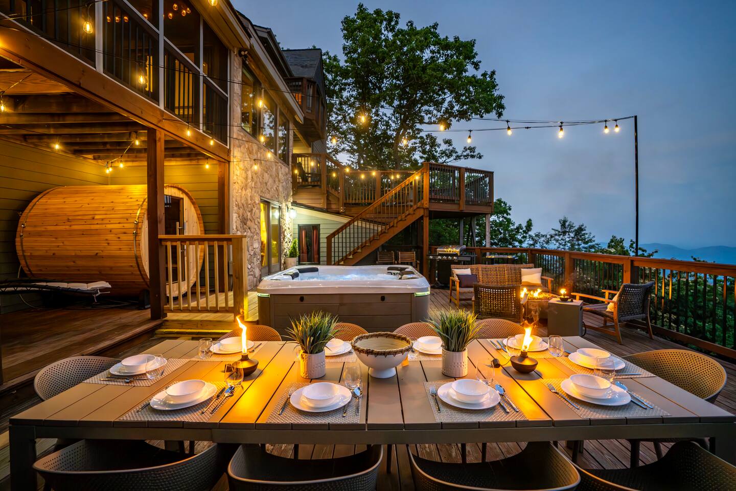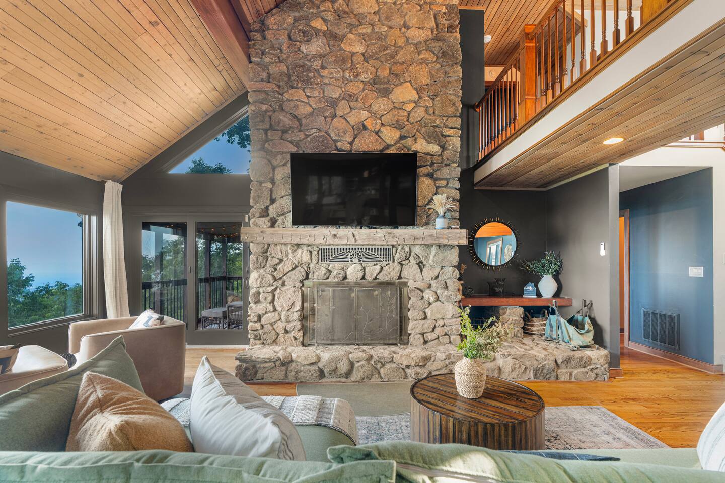 There's a ton to do in the area! Stargazer is about a mile to the slopes and a few minutes’ drive to all the dining and entertainment at Wintergreen. Some of the best hiking trails in the state are off the Blue Ridge Parkway (15 minutes from the home). Also nearby are two sandy-beach-entrance lakes plus a community pool for swimming, and over dozen wineries, breweries, and distilleries- all within a 30 minute drive. The home layout is as follows: Decks: - The small deck directly off of the living room features two Adirondack chairs and a high-top table for 4 to soak in the views - This deck also connects to the larger lower deck, which features a hot tub, barrel sauna, gas firepit (propane provided), grill with prep table, and a dining set for 10. - Additionally, there is a small balcony that connects to both the primary bedroom and a hall bedroom with a few chairs (chairs not pictured). Main level: (Note: there are zero steps required to enter main level from driveway) - Grand living room with big screen TV, wood-burning fireplace, bumper pool table, and separate lounge seating area. Both sofas pull out to beds if needed. - Screened in porch with endless views - Dining table can seat 10, plus room for 4 more at the kitchen bar - Fully stocked kitchen with granite counters, stainless appliances, and gas range. - BR 1: Master bedroom with king bed and ensuite bathroom - Half bath - Laundry room with full size washer and dryer Upper level: - BR 2: Primary bedroom with king bed, fireplace, vaulted beamed ceilings, and access to balcony. Ensuite bathroom features double vanities and tile shower - BR 3: Queen bedroom with balcony access - BR4: Queen bedroom - Hall bath with shower Lower level: - Game room with ping pong table, shuffleboard, darts, TV, and additional refrigerator - BR 5: Queen bedroom with access to lower deck - BR 6 / theater room: Upper portion of this room has a full bed, and lower portion of this room is set up as a theater with 6 leather chairs and massive TV - Hall bath with double vanities and tiled shower/tub combo