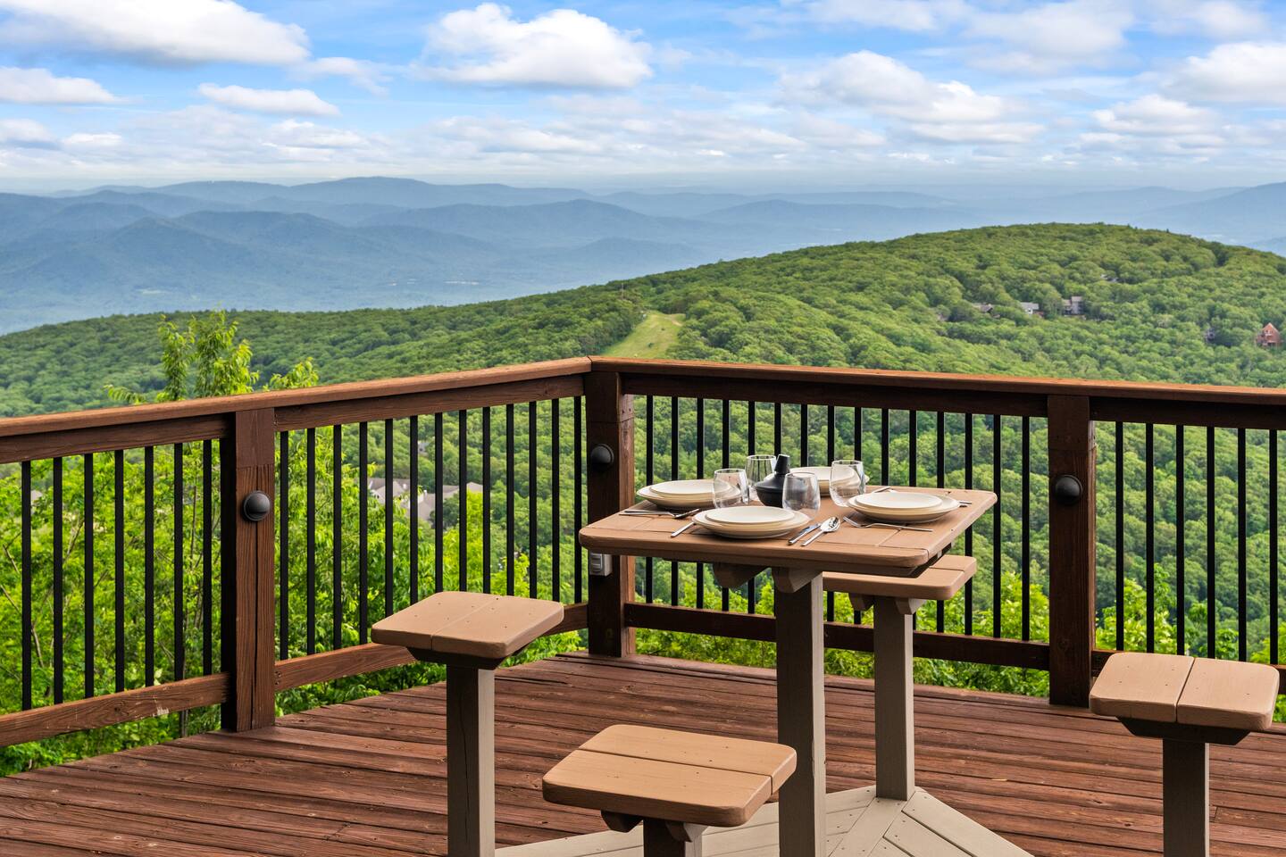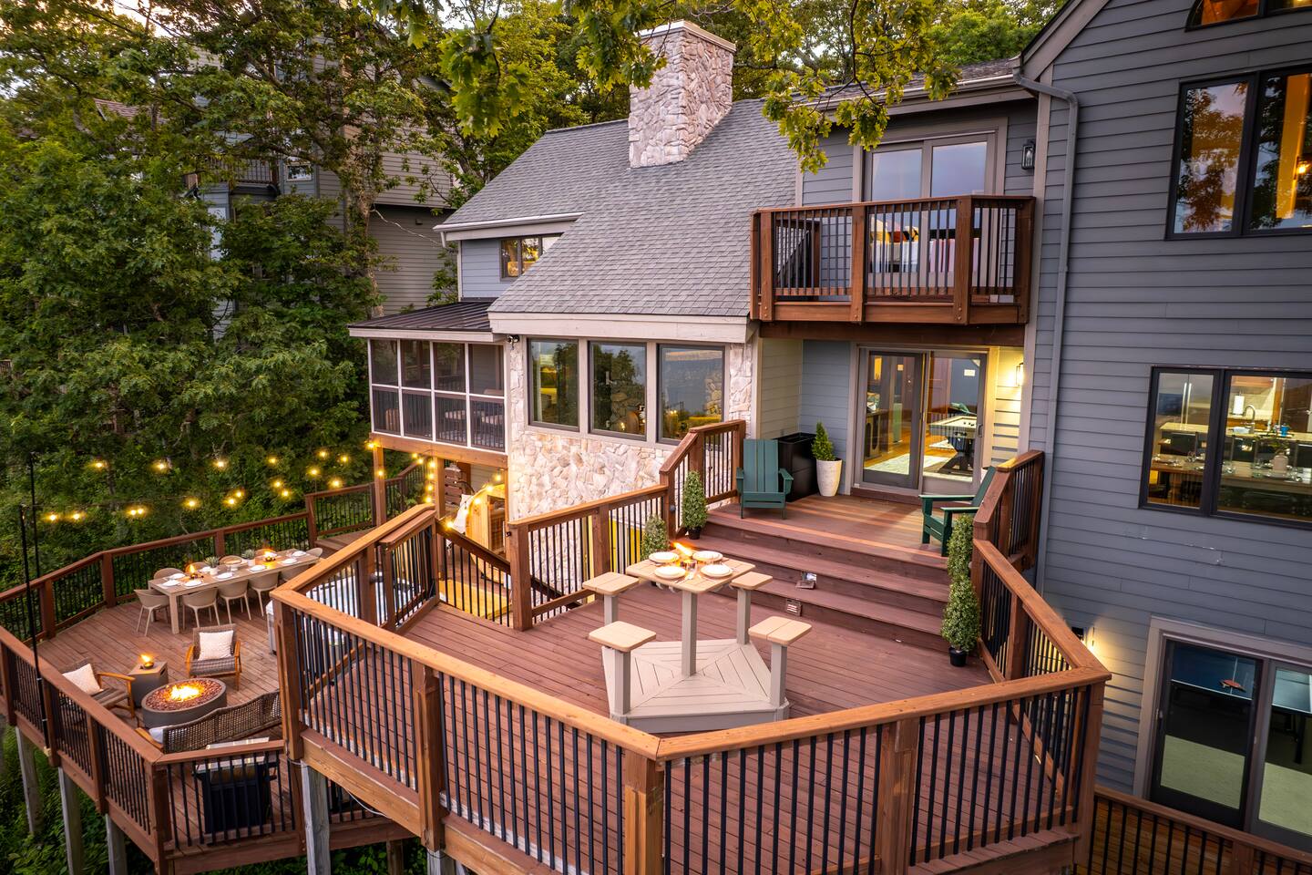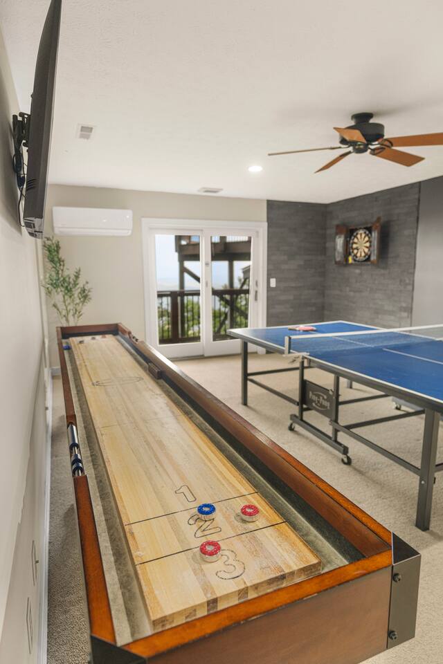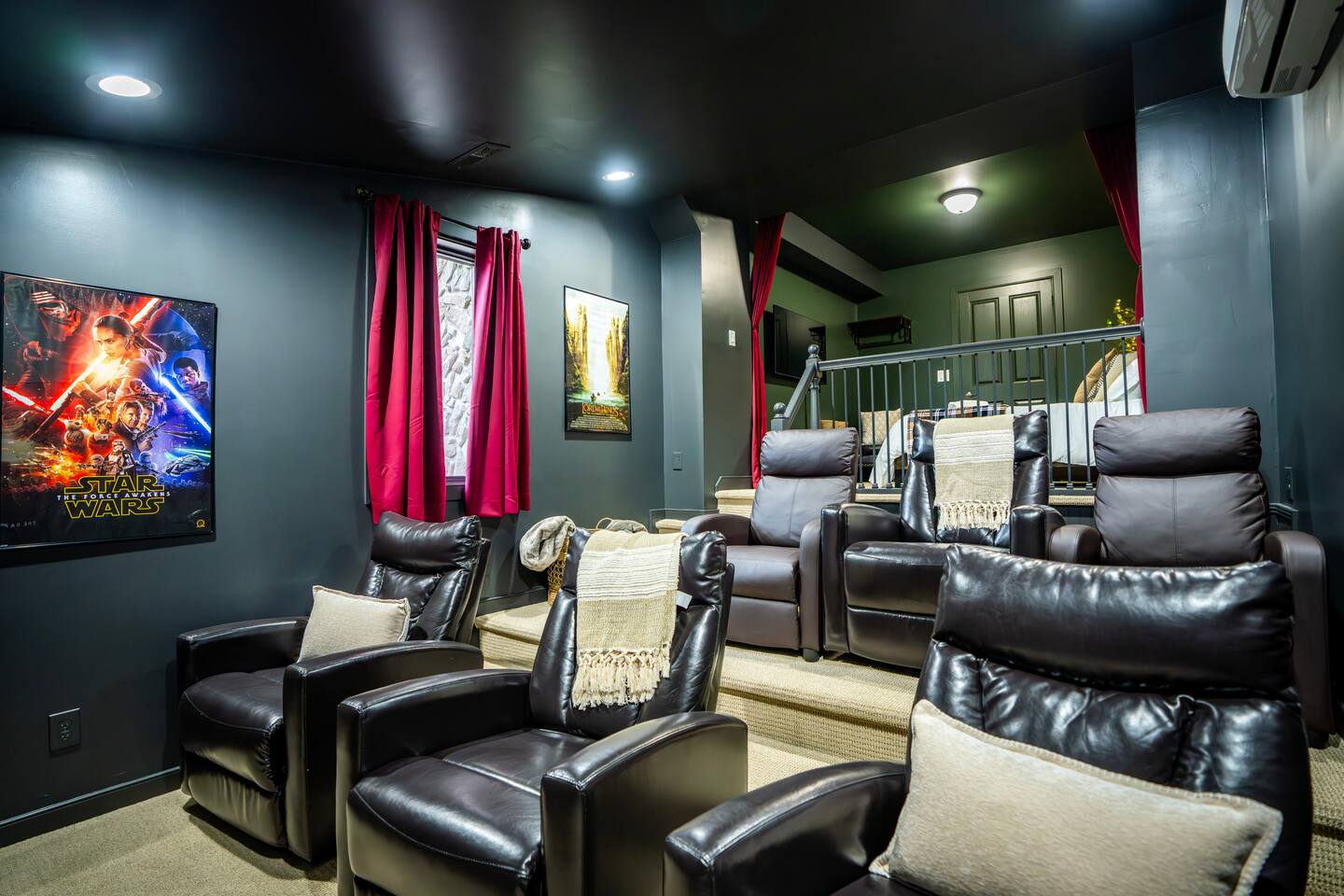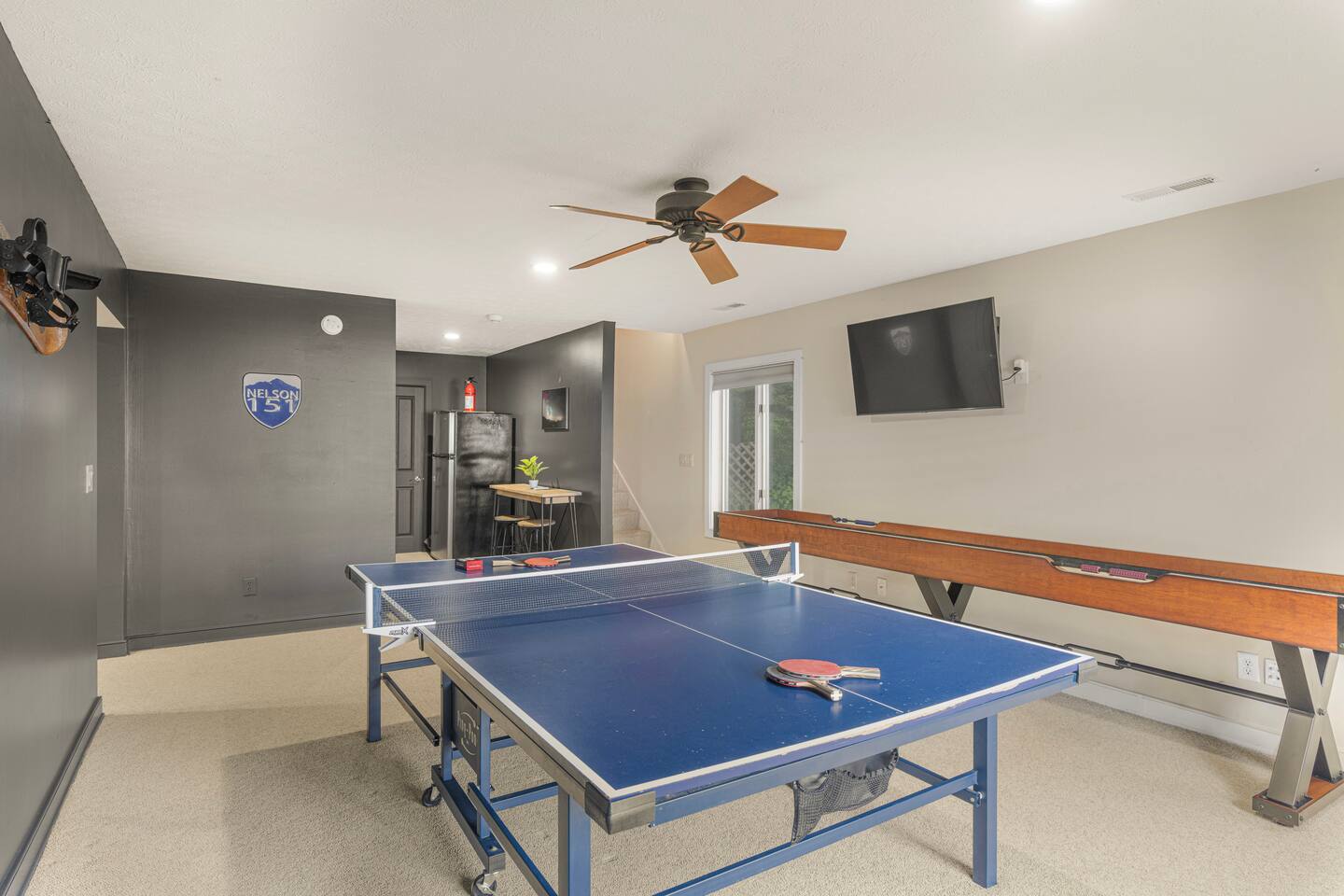 There's a ton to do in the area! Stargazer is about a mile to the slopes and a few minutes’ drive to all the dining and entertainment at Wintergreen. Some of the best hiking trails in the state are off the Blue Ridge Parkway (15 minutes from the home). Also nearby are two sandy-beach-entrance lakes plus a community pool for swimming, and over dozen wineries, breweries, and distilleries- all within a 30 minute drive. The home layout is as follows: Decks: - The small deck directly off of the living room features two Adirondack chairs and a high-top table for 4 to soak in the views - This deck also connects to the larger lower deck, which features a hot tub, barrel sauna, gas firepit (propane provided), grill with prep table, and a dining set for 10. - Additionally, there is a small balcony that connects to both the primary bedroom and a hall bedroom with a few chairs (chairs not pictured). Main level: (Note: there are zero steps required to enter main level from driveway) - Grand living room with big screen TV, wood-burning fireplace, bumper pool table, and separate lounge seating area. Both sofas pull out to beds if needed. - Screened in porch with endless views - Dining table can seat 10, plus room for 4 more at the kitchen bar - Fully stocked kitchen with granite counters, stainless appliances, and gas range. - BR 1: Master bedroom with king bed and ensuite bathroom - Half bath - Laundry room with full size washer and dryer Upper level: - BR 2: Primary bedroom with king bed, fireplace, vaulted beamed ceilings, and access to balcony. Ensuite bathroom features double vanities and tile shower - BR 3: Queen bedroom with balcony access - BR4: Queen bedroom - Hall bath with shower Lower level: - Game room with ping pong table, shuffleboard, darts, TV, and additional refrigerator - BR 5: Queen bedroom with access to lower deck - BR 6 / theater room: Upper portion of this room has a full bed, and lower portion of this room is set up as a theater with 6 leather chairs and massive TV - Hall bath with double vanities and tiled shower/tub combo