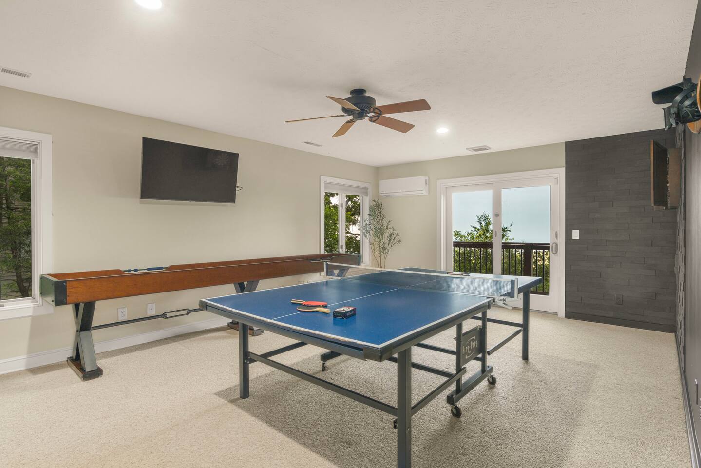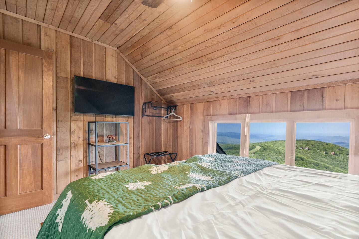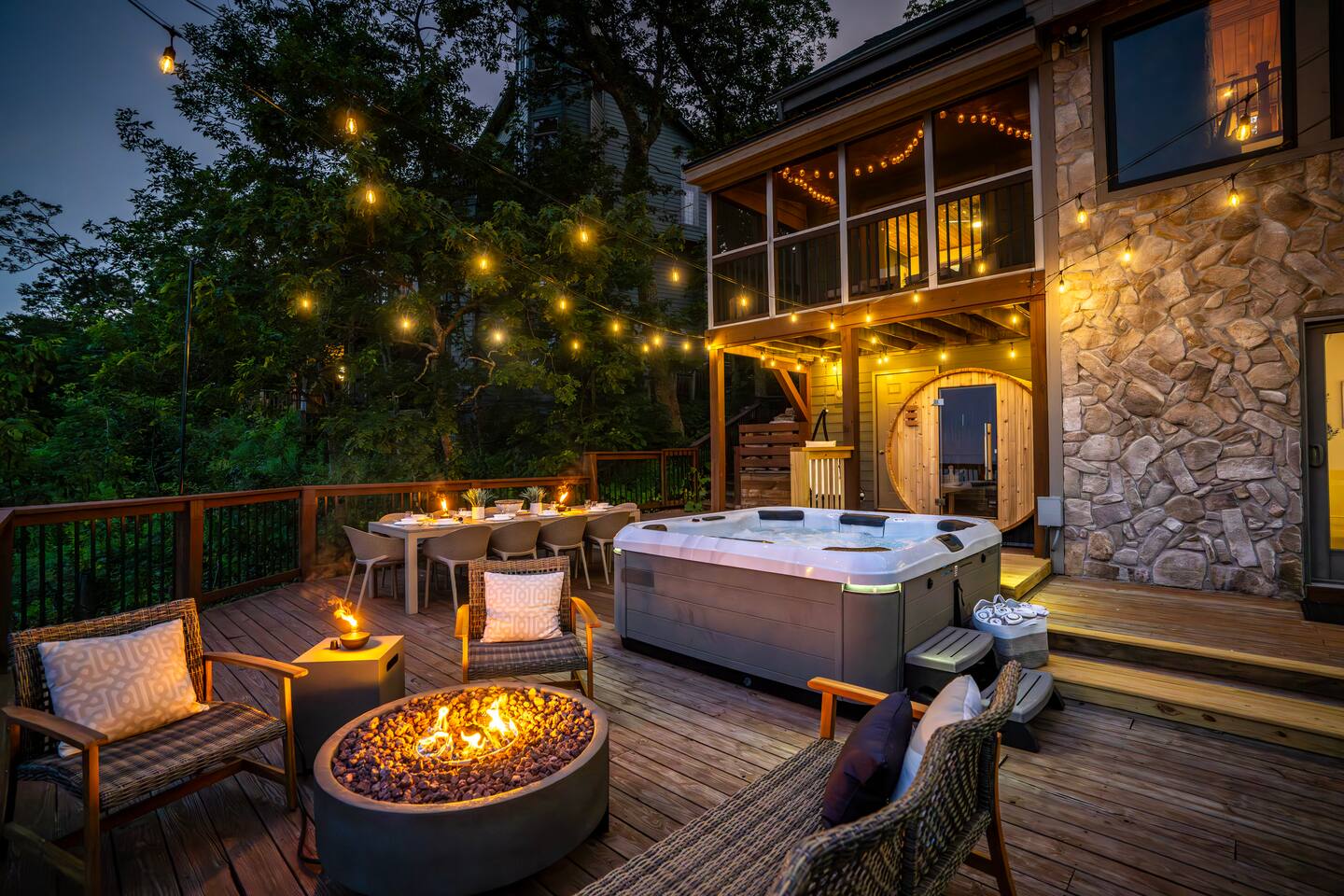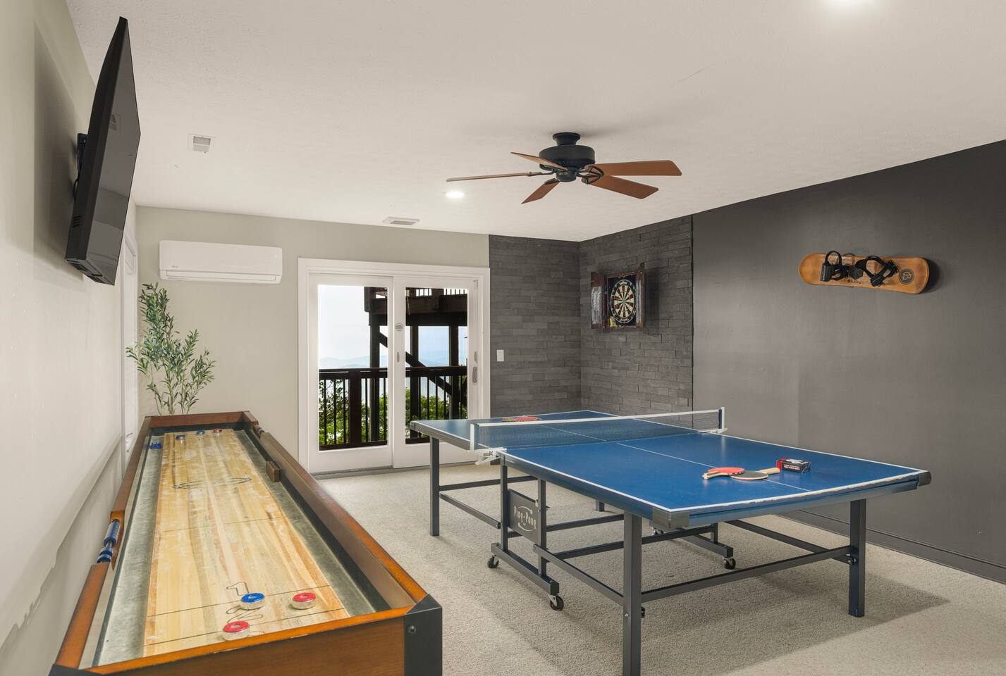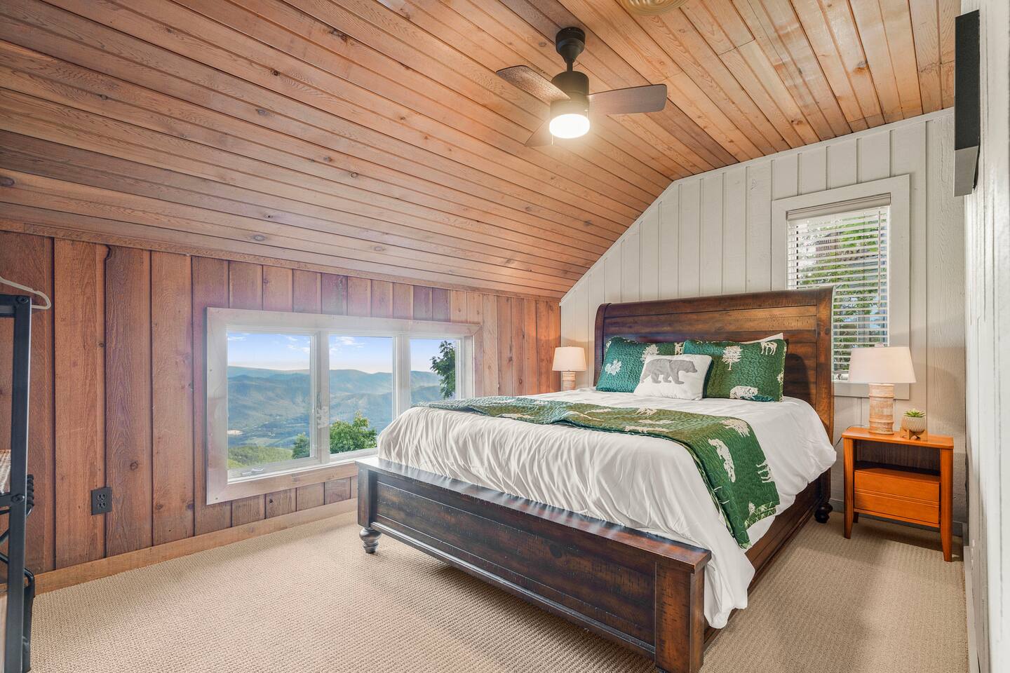 There's a ton to do in the area! Stargazer is about a mile to the slopes and a few minutes’ drive to all the dining and entertainment at Wintergreen. Some of the best hiking trails in the state are off the Blue Ridge Parkway (15 minutes from the home). Also nearby are two sandy-beach-entrance lakes plus a community pool for swimming, and over dozen wineries, breweries, and distilleries- all within a 30 minute drive. The home layout is as follows: Decks: - The small deck directly off of the living room features two Adirondack chairs and a high-top table for 4 to soak in the views - This deck also connects to the larger lower deck, which features a hot tub, barrel sauna, gas firepit (propane provided), grill with prep table, and a dining set for 10. - Additionally, there is a small balcony that connects to both the primary bedroom and a hall bedroom with a few chairs (chairs not pictured). Main level: (Note: there are zero steps required to enter main level from driveway) - Grand living room with big screen TV, wood-burning fireplace, bumper pool table, and separate lounge seating area. Both sofas pull out to beds if needed. - Screened in porch with endless views - Dining table can seat 10, plus room for 4 more at the kitchen bar - Fully stocked kitchen with granite counters, stainless appliances, and gas range. - BR 1: Master bedroom with king bed and ensuite bathroom - Half bath - Laundry room with full size washer and dryer Upper level: - BR 2: Primary bedroom with king bed, fireplace, vaulted beamed ceilings, and access to balcony. Ensuite bathroom features double vanities and tile shower - BR 3: Queen bedroom with balcony access - BR4: Queen bedroom - Hall bath with shower Lower level: - Game room with ping pong table, shuffleboard, darts, TV, and additional refrigerator - BR 5: Queen bedroom with access to lower deck - BR 6 / theater room: Upper portion of this room has a full bed, and lower portion of this room is set up as a theater with 6 leather chairs and massive TV - Hall bath with double vanities and tiled shower/tub combo