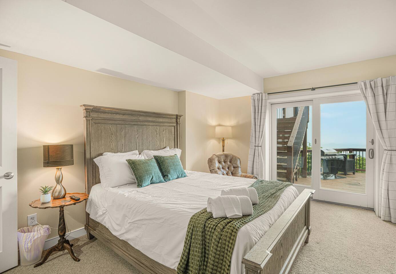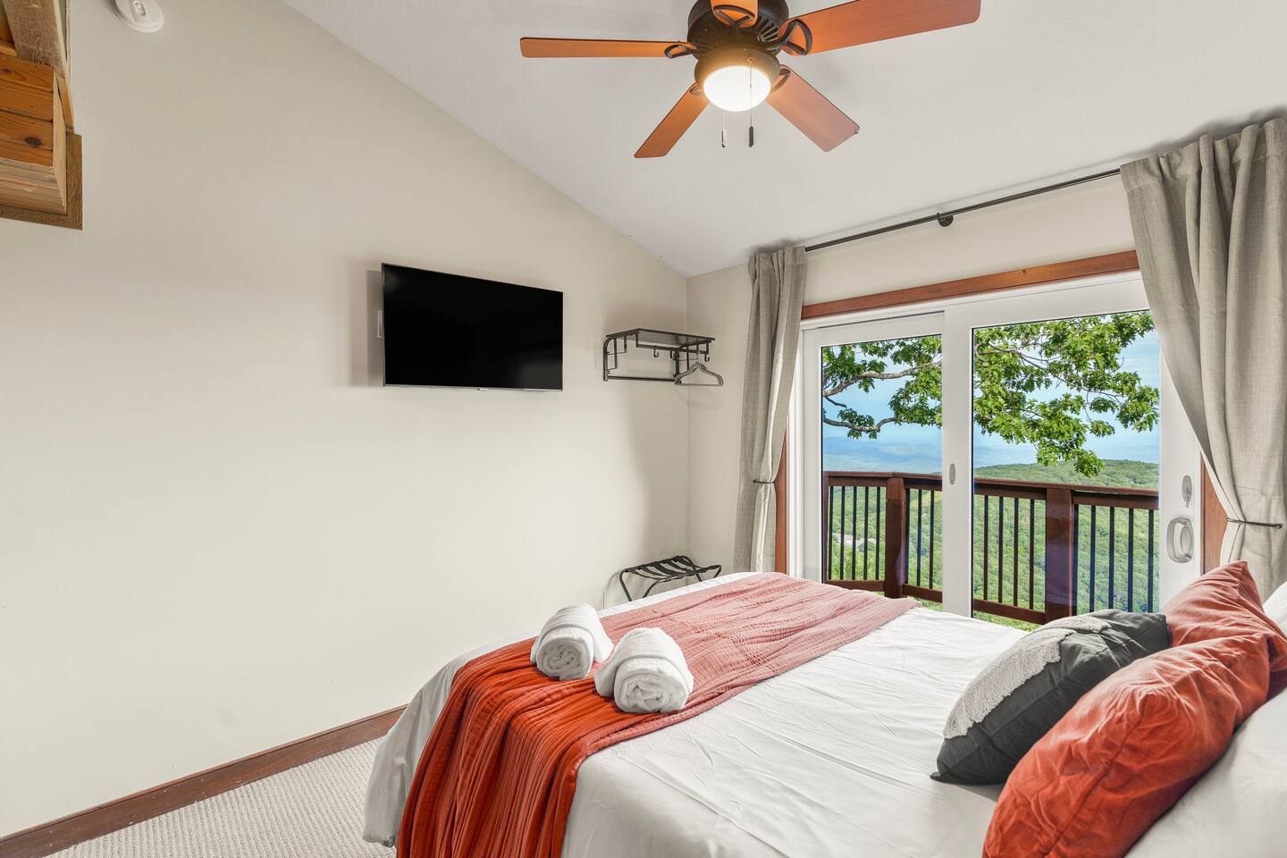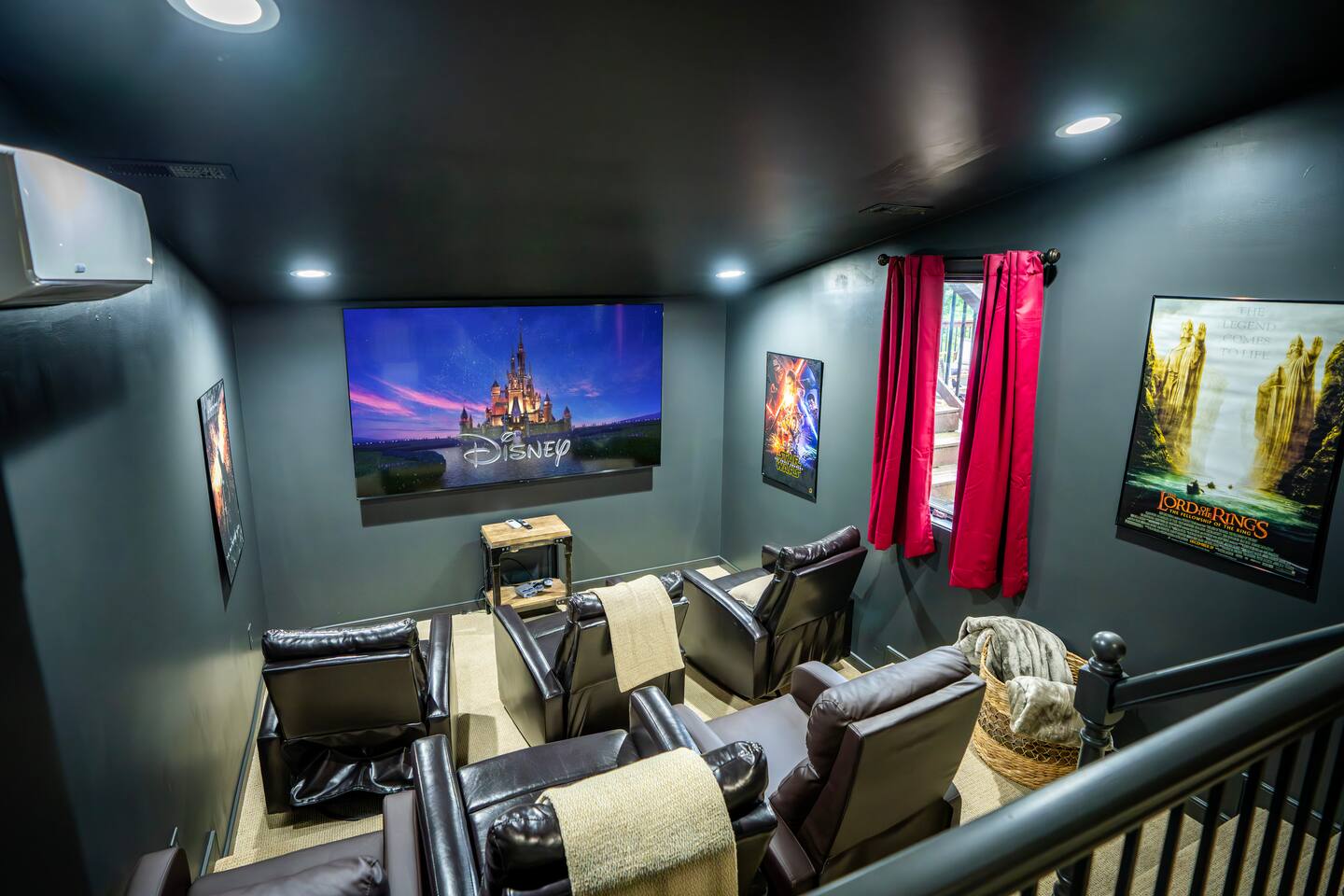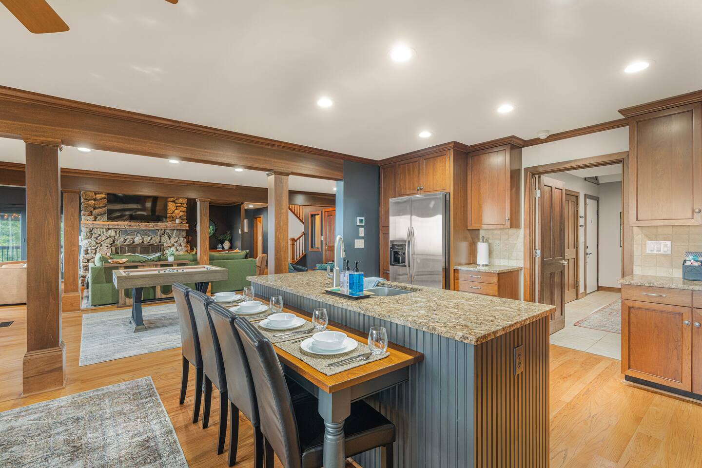 There's a ton to do in the area! Stargazer is about a mile to the slopes and a few minutes’ drive to all the dining and entertainment at Wintergreen. Some of the best hiking trails in the state are off the Blue Ridge Parkway (15 minutes from the home). Also nearby are two sandy-beach-entrance lakes plus a community pool for swimming, and over dozen wineries, breweries, and distilleries- all within a 30 minute drive. The home layout is as follows: Decks: - The small deck directly off of the living room features two Adirondack chairs and a high-top table for 4 to soak in the views - This deck also connects to the larger lower deck, which features a hot tub, barrel sauna, gas firepit (propane provided), grill with prep table, and a dining set for 10. - Additionally, there is a small balcony that connects to both the primary bedroom and a hall bedroom with a few chairs (chairs not pictured). Main level: (Note: there are zero steps required to enter main level from driveway) - Grand living room with big screen TV, wood-burning fireplace, bumper pool table, and separate lounge seating area. Both sofas pull out to beds if needed. - Screened in porch with endless views - Dining table can seat 10, plus room for 4 more at the kitchen bar - Fully stocked kitchen with granite counters, stainless appliances, and gas range. - BR 1: Master bedroom with king bed and ensuite bathroom - Half bath - Laundry room with full size washer and dryer Upper level: - BR 2: Primary bedroom with king bed, fireplace, vaulted beamed ceilings, and access to balcony. Ensuite bathroom features double vanities and tile shower - BR 3: Queen bedroom with balcony access - BR4: Queen bedroom - Hall bath with shower Lower level: - Game room with ping pong table, shuffleboard, darts, TV, and additional refrigerator - BR 5: Queen bedroom with access to lower deck - BR 6 / theater room: Upper portion of this room has a full bed, and lower portion of this room is set up as a theater with 6 leather chairs and massive TV - Hall bath with double vanities and tiled shower/tub combo